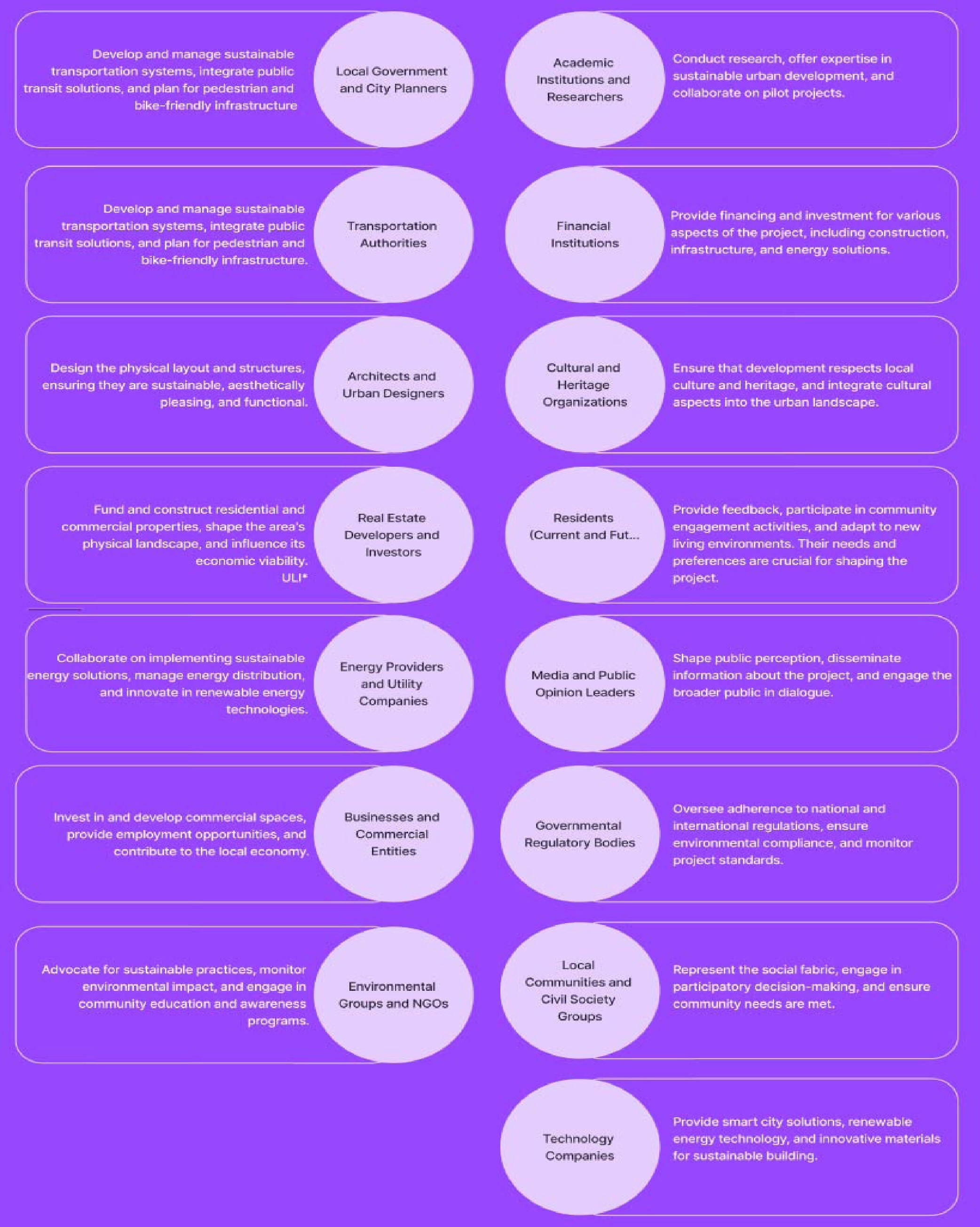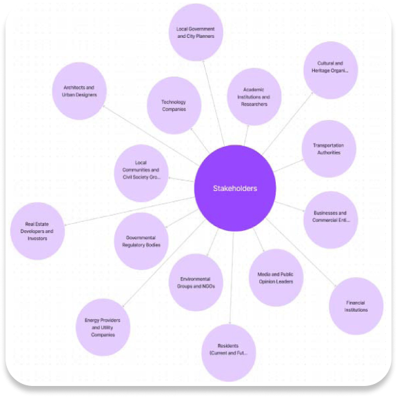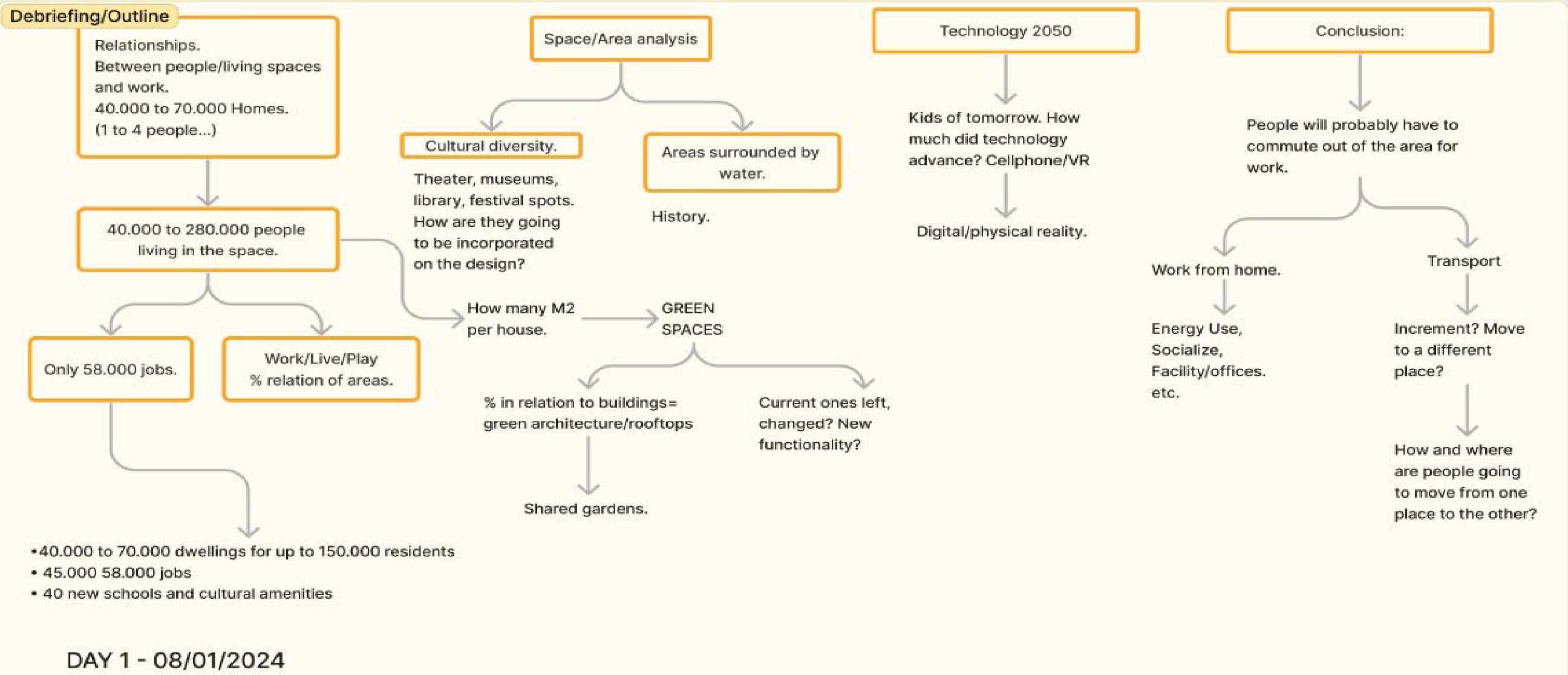 We mapped stakeholders—from municipalities to residents—and I created a flow map highlighting and summarizing the four key aspects that could guide our focal point. This helped identify major friction points, such as the imbalance between planned housing and available workplaces, as well as the likely commute flows between them. This led us to question how transport issues would be addressed and what measures might be implemented. Other questions that emerged included how green and community spaces would be incorporated, how work–life–play balance would be achieved, and many more.