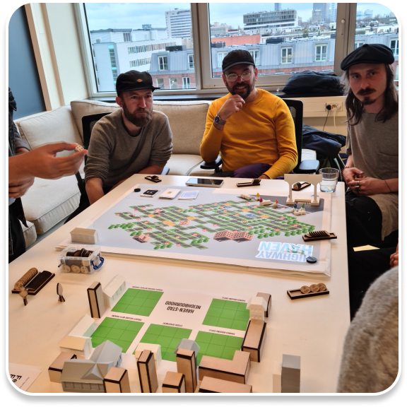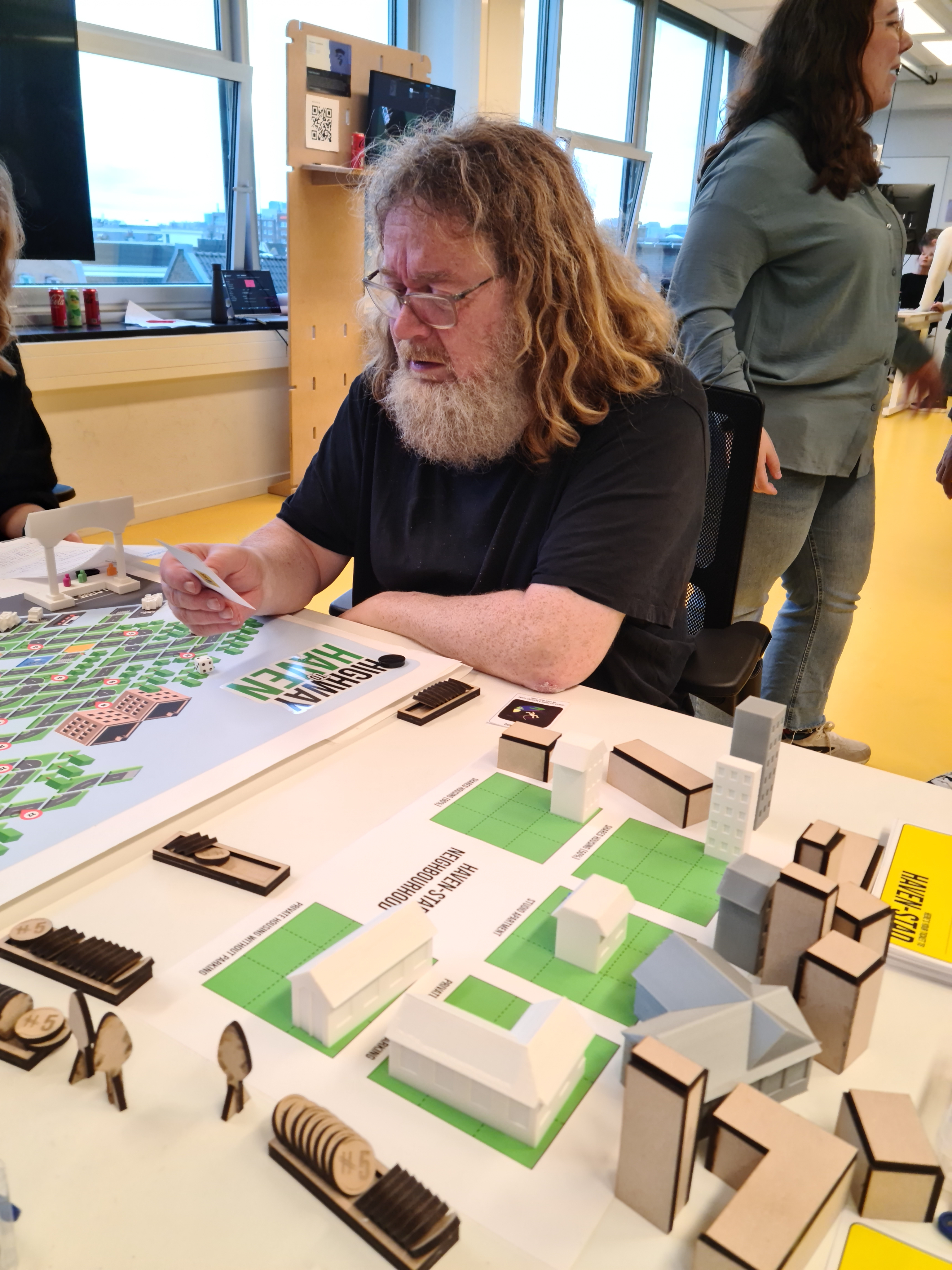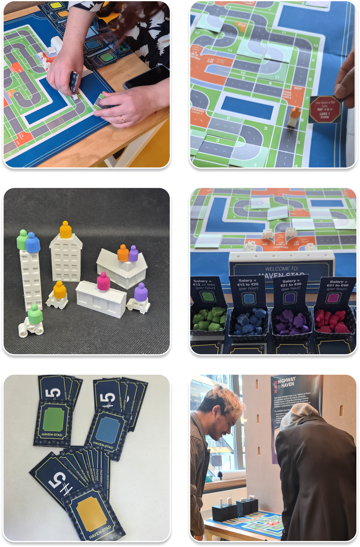The first playable prototype was developed collaboratively. It consisted of a large board with multiple branching paths, coloured pawns, game currency, and action cards. Each route led to different outcomes depending on the decisions made, and specific spaces triggered action cards that introduced both challenges and opportunities. We tested this version with ARCAM staff, teachers and peers from the Master in Digital Design, and designers from various agencies during a university event.